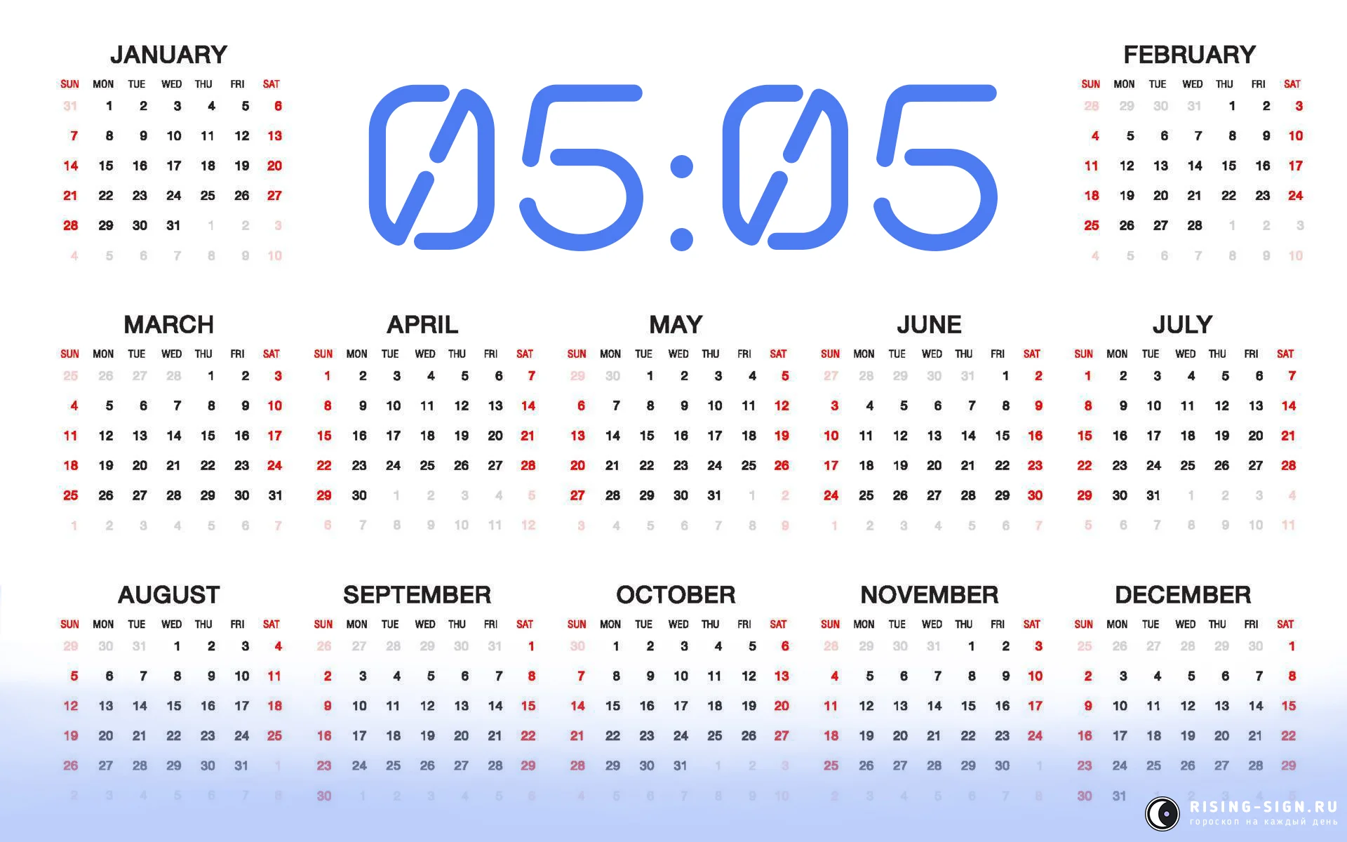 Для тех, кто в отношениях, 05:05 — призыв внести свежесть в союз. Хватит рутины и молчаливых ужинов. Пора отправиться в путешествие, устроить неожиданное свидание или просто заговорить о чувствах, которые давно замолчали.